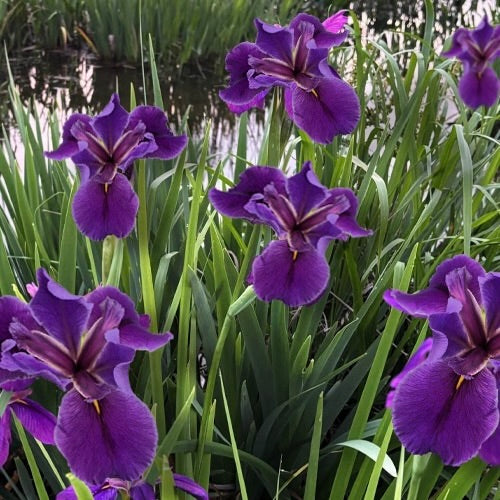 The Rocky Hunt Iris is a striking perennial plant known for its large, showy blooms and ability to "walk" by forming new plantlets at the ends of its flower stalks! It can be used as a border plant, in mass plantings, or as a focal point in the garden. It also makes a good cut flower. It typically blooms in late spring or early summer!