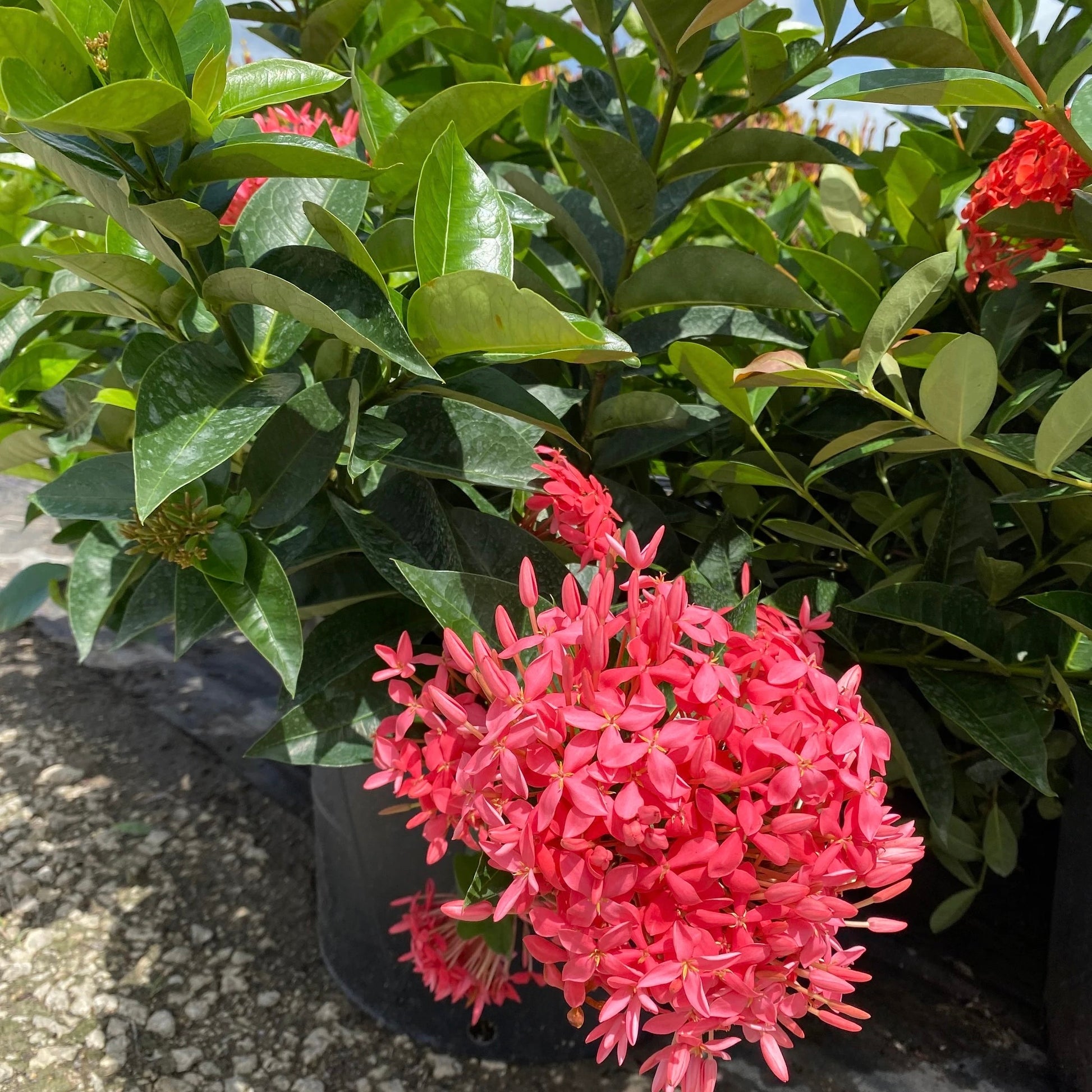 Ixora Nora Grant is a popular for its vibrant, pinkish-red flower clusters against glossy green foliage! It's a tropical shrub that thrives in warm climates, offering year-round color and is often used as a hedge, accent plant, or in containers! This plant blooms fully in the summers and attracts common pollinators, making it a great addition to the environment! This plant can grow to around 3-6 feet but can be kept at a preferred height