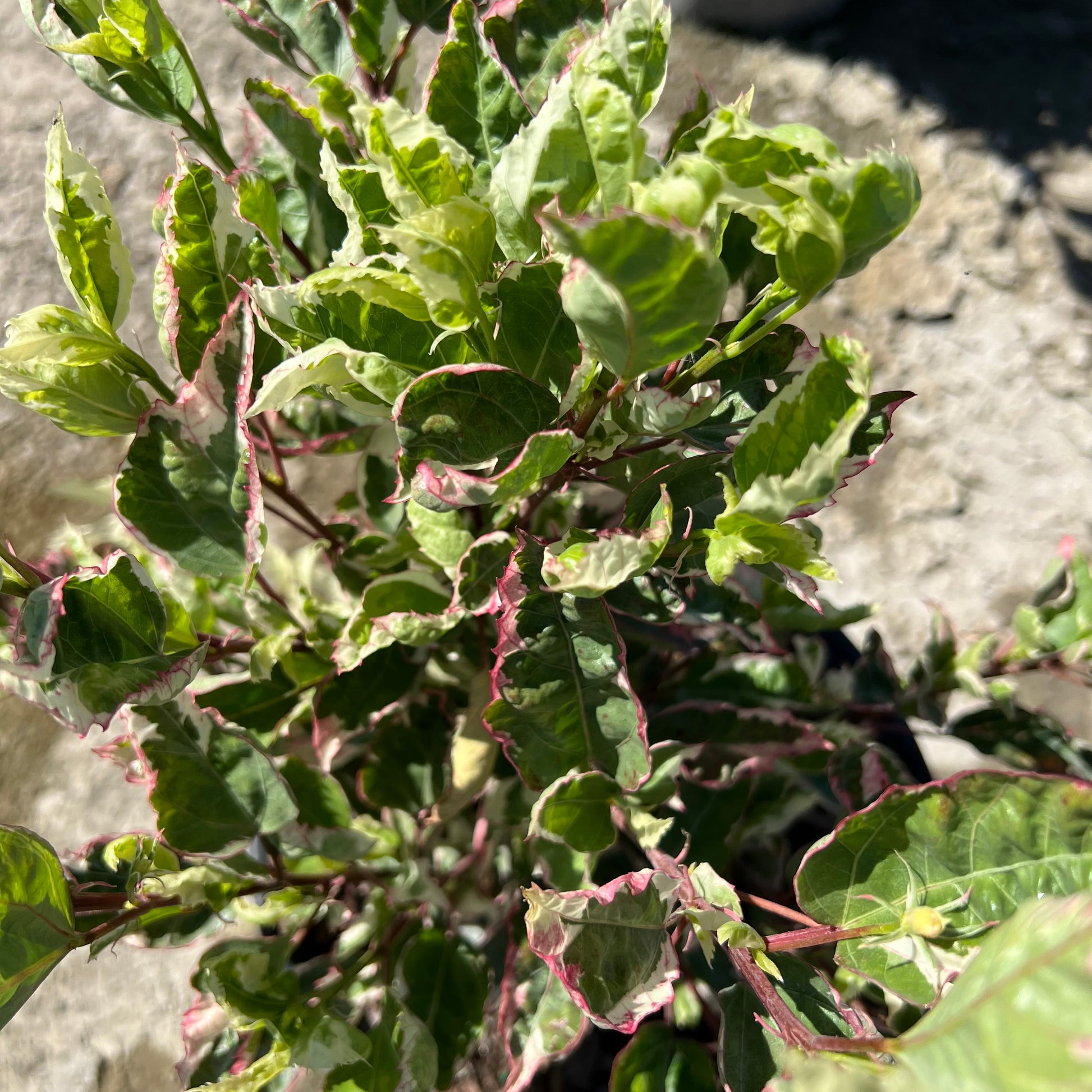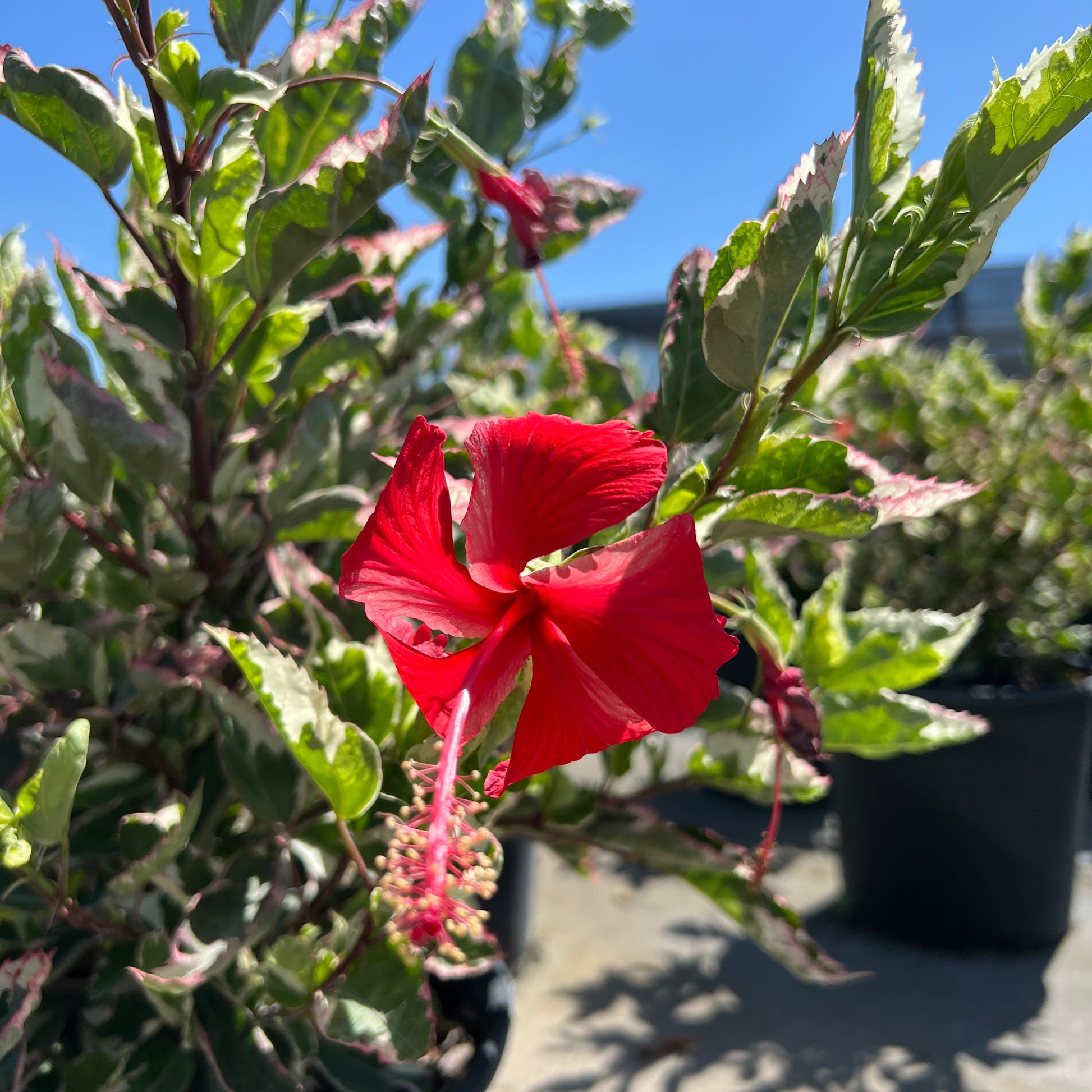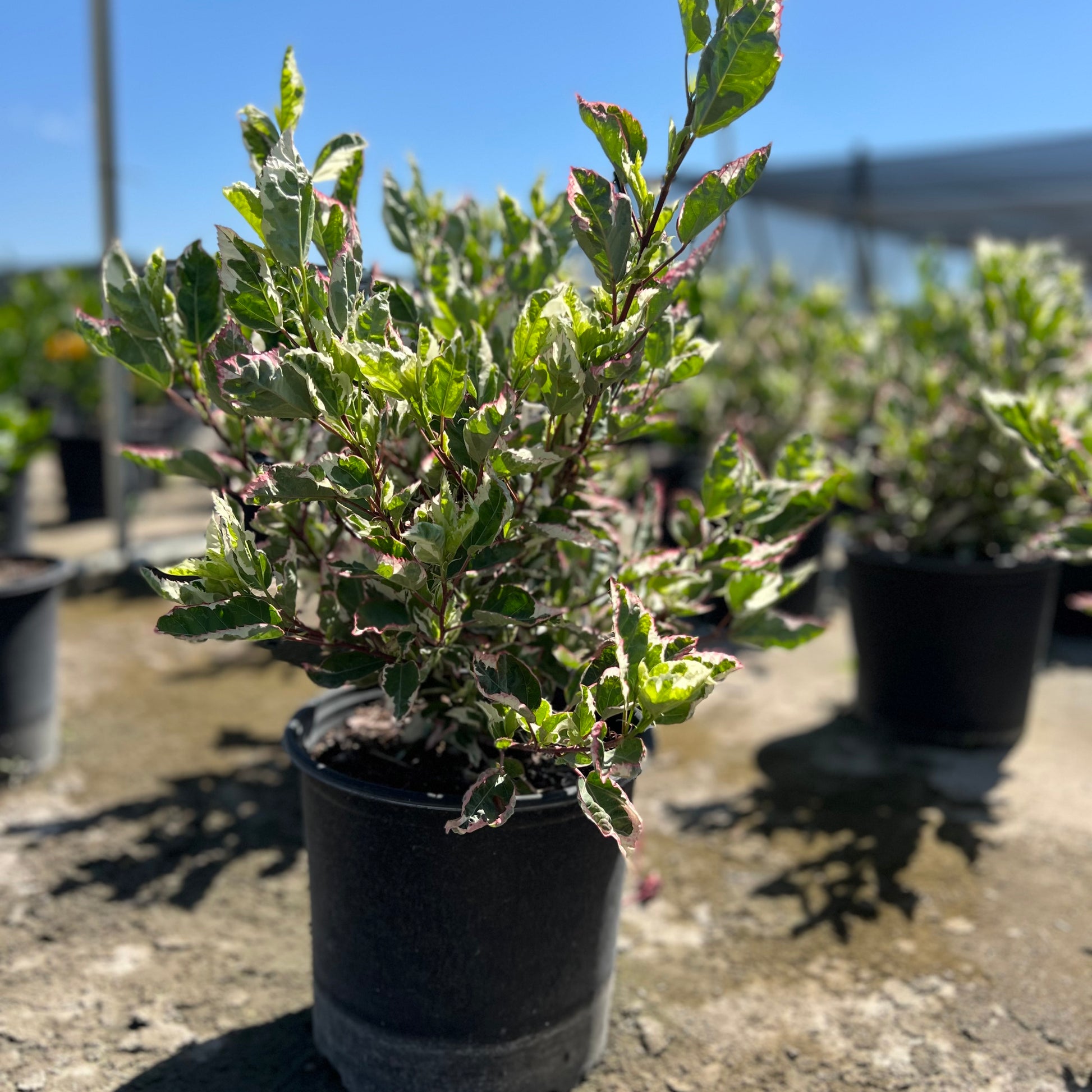 The Snow Queen Hibiscus is a popular tropical shrub known for its vibrant red flowers and unique variegated foliage! The leaves display a mix of green, white, and pink variegation, making it visually appealing even when not in bloom. The Snow Queen hibiscus is easy to grow, thrives in full sun, and attracts pollinators like butterflies and hummingbirds!